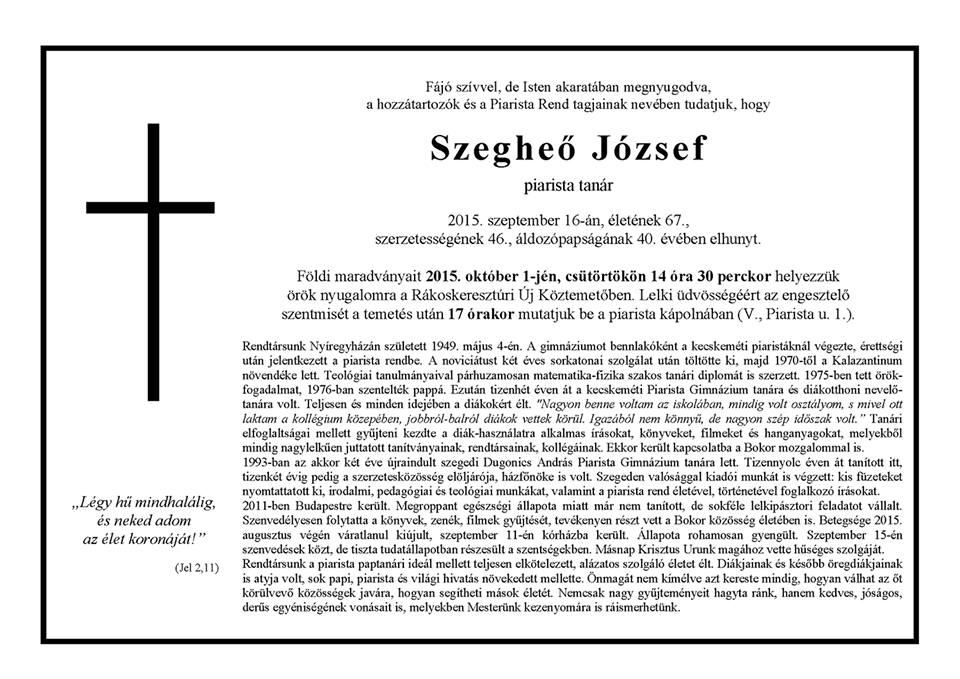 SzegheQ József (Totya)Szegheő József (Totya) testvérünket 2015. szeptember 16-án ölelte magához az Atya mennyei otthonában.