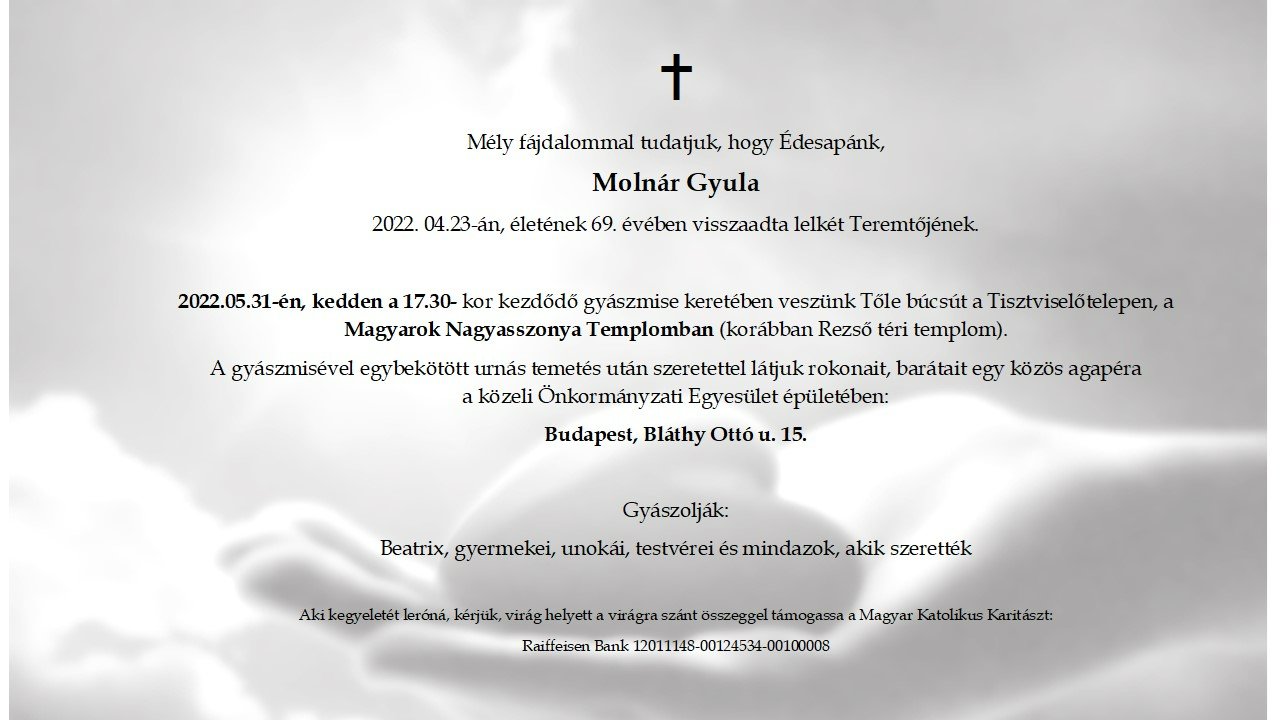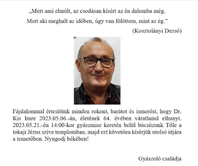 2021. február 6-án (szombaton) 15 órakor kezdődik gyászmiséje a Törökbálinti Római Katolikus Templomban (Pelsőczy Ferenc utca), ahol hálát adunk életéért, majd közösségi megemlékezést tartunk a templomban.