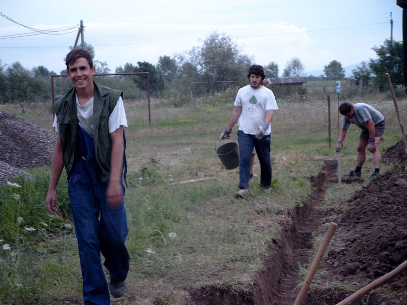 A munkával jól haladtunk a 4. napon, csütörtök estére, mind a 14 gödör és az összekötő vájúk kiásása, az egyik sor teljes bebetonozása-vasalása elkészült. Bíztunk abban, hogy be tudjuk fejezni az alapozást a hátralévő időben, ebben a tempóban. A cél reálisnak látszott. De nem így történt. Másnap derült ki, hogy rossz volt a tervrajz, melyet egy helybéli építész készített és a jobb oldali sort 4 m-rel kijjebb kellett volna ásni. A mérnököt, aki kijelölte a munkaterületet és a tervrajzot most nem minősíteném. A hiba nem a mi hozzáállásunkban volt. A műveletet itt fejeztük be. A szerszámokat összeszedtük, elpakoltunk mindent. A fiúk feszültség levezetésként egy napot fociztak. A hátralévő két napban pedig bejártuk Kárpátalja szép magyar városait-várait, még a Vereckei-hágóhoz is elmentünk kirándulni.